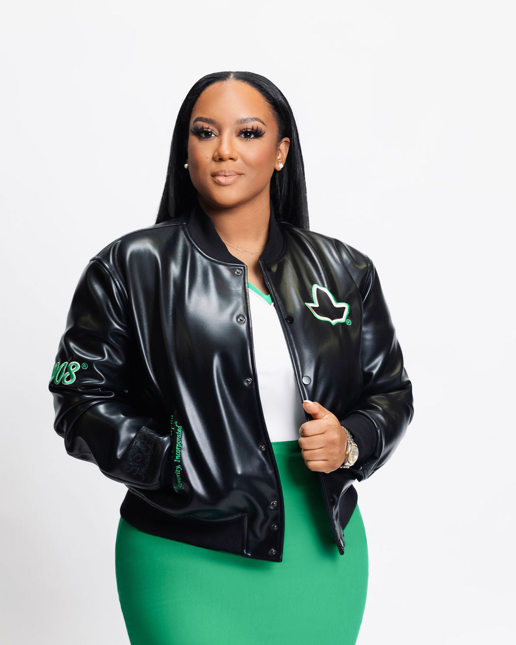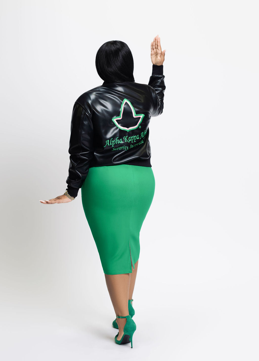 Be the first to own the all-new Pretty Bomber Jacket, designed especially for the women of Alpha Kappa Alpha Sorority, Incorporated®. This fresh design brings together luxury, sustainability, and sorority pride in one stunning piece.